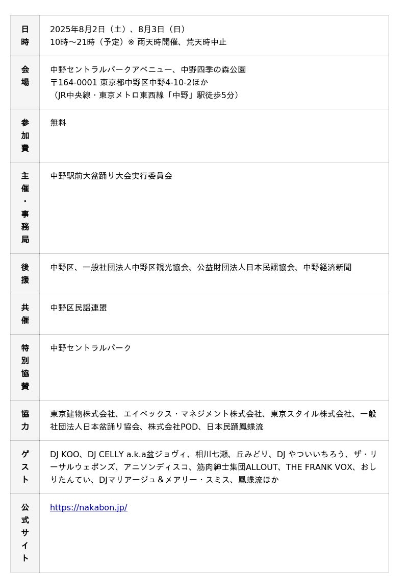 ※ 盆踊りに関する一般の方からのお問い合わせは公式サイト(https://nakabon.jp/)からお願いします。