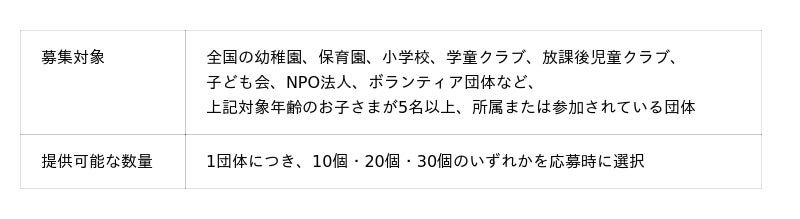 - 寄付500個、団体応募・個人応募2,000個の合計2,500個を無償で提供する。