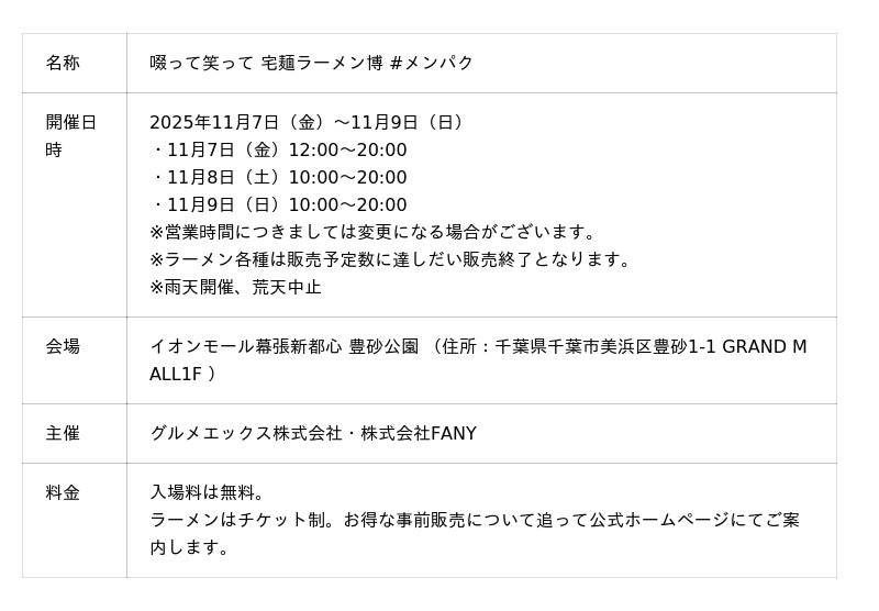 国内最大級のラーメン専門通販サイト「宅麺.com」を運営するグルメエックス株式会社(本社:東京都港区、代表取締役社長:冨澤 文秀)は、吉本興業グループの株式会社FANY(本社:東京都新宿区、代表取締役社長:梁 弘一)と共同で、ラーメンイベント「啜って 笑って 宅麺 × よしもと ラーメン博 #メンパク」を開催します。日本が世界に誇るトップコンテンツの「ラーメン」と「お笑い」がタッグを組んだ、おいしくて笑える3日間。本イベントでは、有名ラーメン店と人気芸人のコラボラーメンなど、全国から選りすぐった約30種類の名店のラーメン・つけ麺が集結します。さらに、人気芸人たちによるステージで会場を盛り上げます。美味しいラーメンとお笑いの力を通してご来場の皆さまに、心に残る時間を提供します。