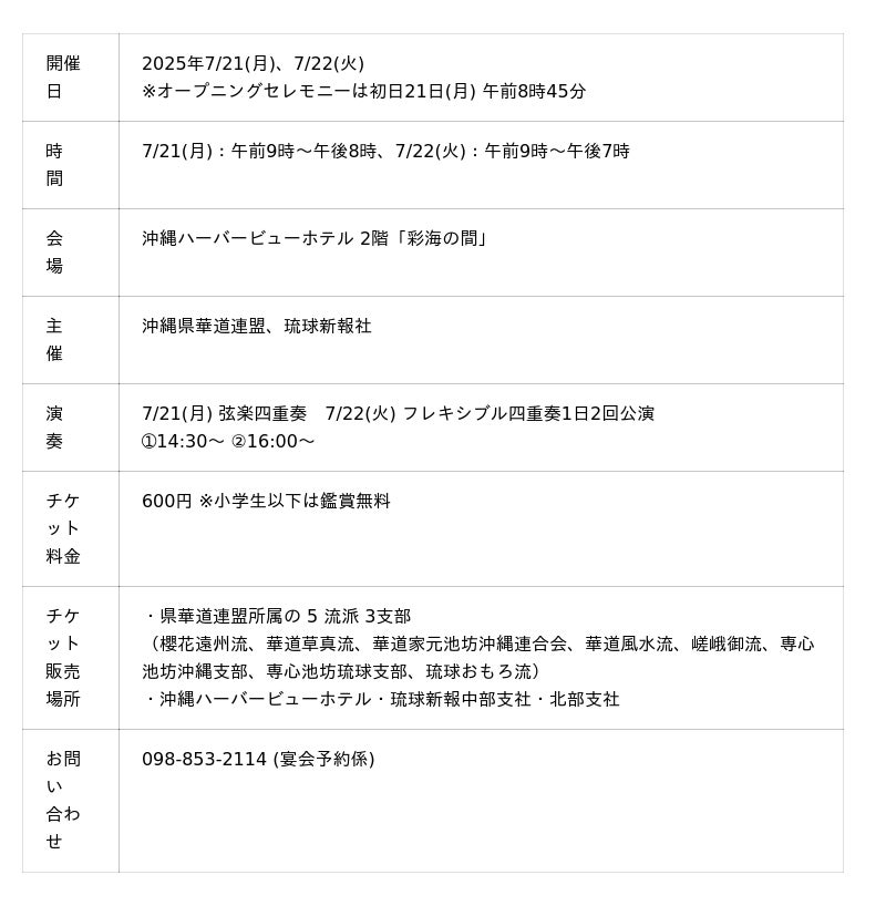 2025年6月7日に開業50周年を迎えた沖縄ハーバービューホテル(沖縄県那覇市泉崎2-46/総支配人:森山 真也)は、約100杯の生け花が集う「第45回チャリティーいけばな展」(主催:沖縄県華道連盟、琉球新報社)を2025年7月21日(月)、22日(火)の2日間限定で開催いたします。