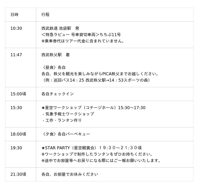 ・「PICA秩父」宿泊および夕朝食代・8月17日(日)号車貸切特急料金・貸切バス運賃・添乗員費用