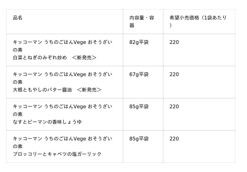 キッコーマン食品株式会社は、8月4日に、1/2日分の野菜(*)を手軽にとることができる「キッコーマン うちのごはんVege おそうざいの素」シリーズの、「白菜とねぎのみぞれ炒め」と「大根ともやしのバター醤油」を全国で新発売します。