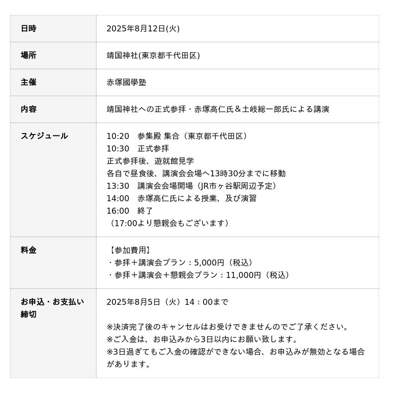 2025年8月12日(火)、赤塚國學塾は靖国神社にて、正式参拝と特別講演会を開催いたします(主催:フォーチュンアンドカンパニー)。靖国神社は、国のために命を捧げた英霊を祀る神聖な場所として、多くの人々の敬意を集めてきました。