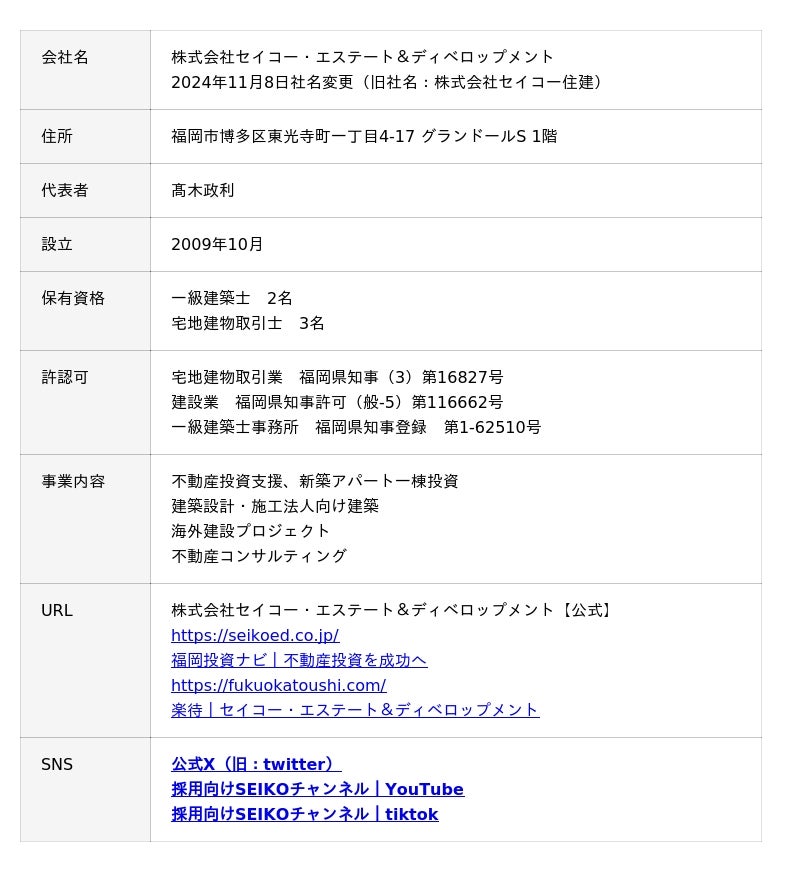 株式会社セイコー・エステート&ディベロップメントは、福岡市博多区を拠点に不動産投資支援と建築事業を展開しています。土地仕入れから融資戦略、建築プラン、施工、入居者管理までをワンストップで提供し、投資家の資産形成を伴走型で支援することを理念としています。福岡エリアでの不動産投資において、「投資家目線に立ったアパート建築会社」として、多くの投資家から高い信頼をいただいております。