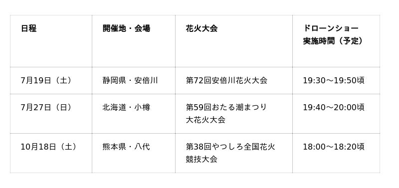 本イベントは、2025年7月19日(土)の静岡・安倍川花火大会を皮切りに、北海道・熊本の全国3ヵ所で順次開催される予定です。