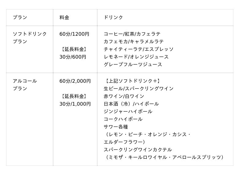フリーWi-Fi、モバイルバッテリーの貸し出しはもちろん、ソフトドリンクやアルコール類を含むフリードリンクに、スナックやスイーツもご自由にお楽しみいただけます。 また、新たにパラソルや大型冷風機を設置し、夏の暑さを和らげながら快適にお過ごしいただける空間を実現いたしました。