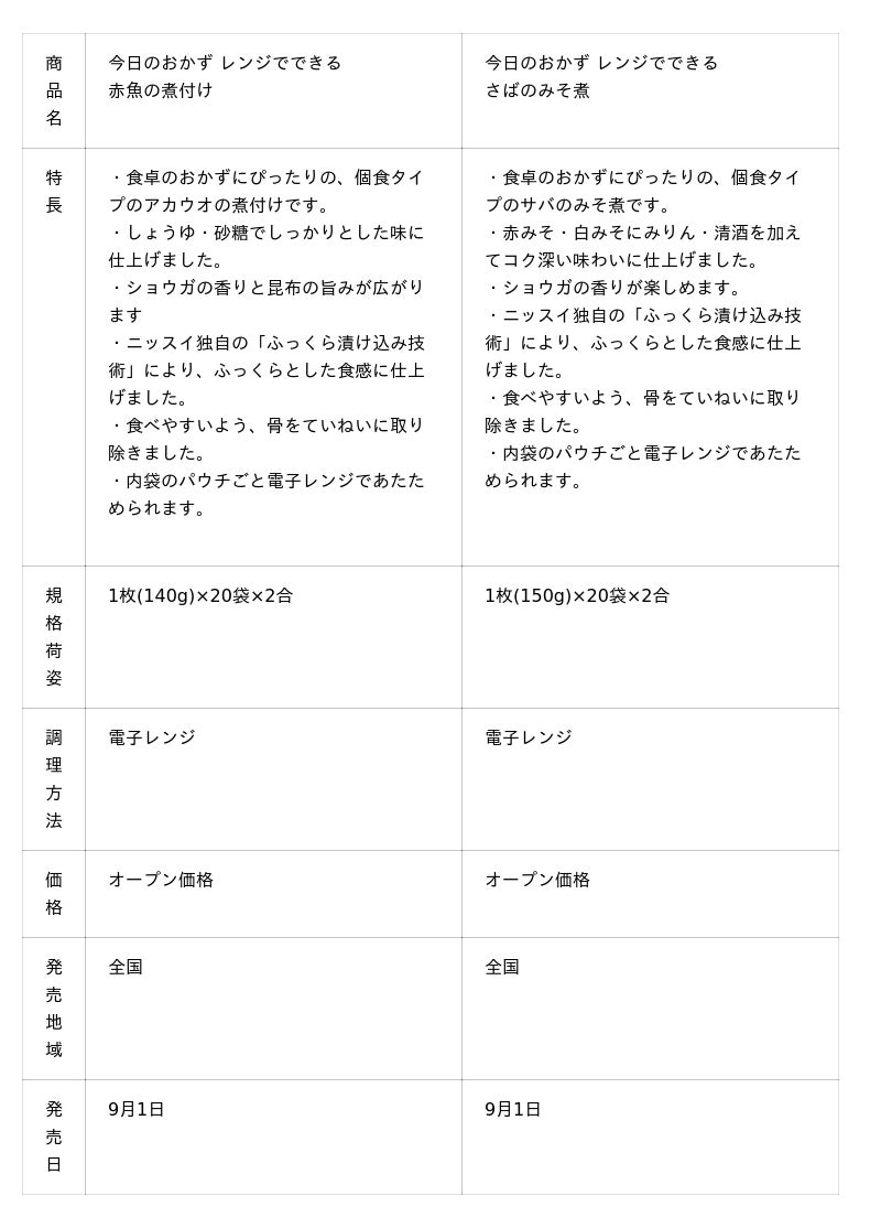 電子レンジ調理の煮魚メニュー「今日のおかず レンジでできる 赤魚の煮付け」・「同 さばのみそ煮」(家庭用冷凍食品)を新発売