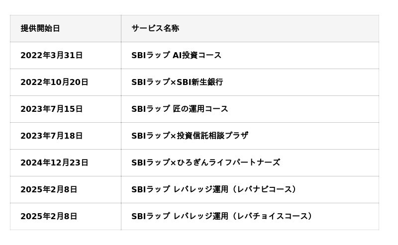 「SBIラップ」は、FOLIOが提供するプラットフォーム「4RAP(フォーラップ)」を採用し、運用業者が持つノウハウを最大限に活かした質の高い運用サービスを展開しています。2022年3月の「SBIラップ」(AI投資コース)の提供を皮切りに、現在では以下7つの投資一任運用サービスを提供しています。