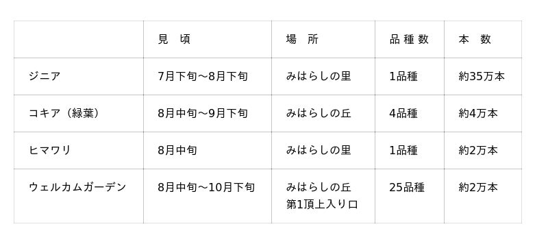 みはらしの丘では、爽やかなライムグリーンのコキアが成長中です。現在約30cmのコキアは、真夏の日差しを浴びて8月中には“ふわふわ”とした大きく丸い形状で約70cmに成長します。また、多彩なカラーバリエーションが魅力の「ジニア」や、夏空に映える「ヒマワリ」なども見頃を迎え、訪れる人々に癒しと元気を与えてくれます。