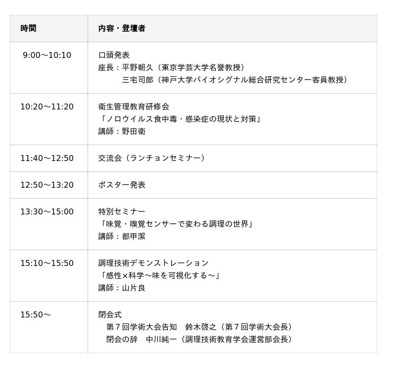 調理師学校教員などによる研究発表に加え、講演、パネルディスカッション、衛生管理教育研修会、調理技術デモンストレーションなどが行われます。