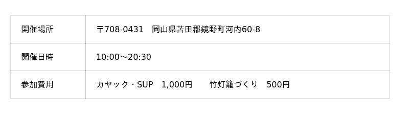 (一社)鏡野観光局主催。カヤック、SUP、竹灯籠づくりなど一人でもみんなでも夏を楽しめます!