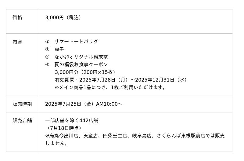 株式会社なか卯(代表取締役社長:池松 博誠 本社:東京都港区)が展開する丼ぶりと京風うどんの「なか卯」は、7月25日(金)AM10:00より、限定グッズとお得なクーポンが入った「なか卯の夏の福袋(税込3,000円)」を全国のなか卯にて数量限定で販売します。