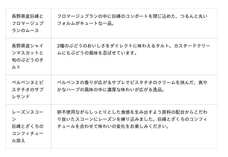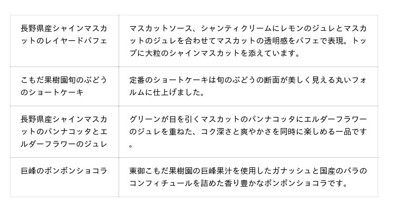 ペストリーシェフ 石和 悟より東御こもだ果樹園で育ったぶどうは、こだわりの栽培方法で一房ひと房丁寧に育てられ、ぶどう本来の味がぎゅっと凝縮されています。秋のアフタヌーンティーのスイーツを考案するにあたり、このおいしさを最大限に味わっていただきたく、クリームやジュレの甘味や生地の食感なども原料を細かく調節して一つひとつ作り上げました。ぜひご賞味いただければ幸いです。