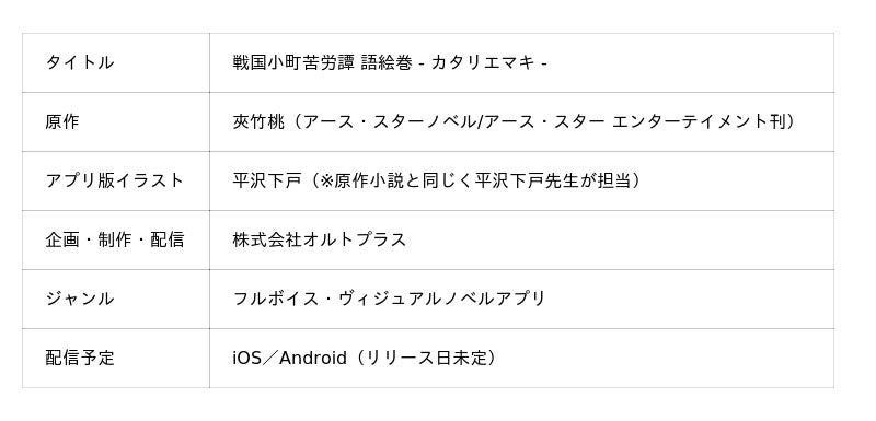 株式会社オルトプラス(本社:東京都豊島区、代表取締役社長:石井 武、以下「オルトプラス」)は、株式会社アース・スター エンターテイメント(本社:東京都品川区、代表取締役社長:幕内 和博)が出版する人気小説原作『戦国小町苦労譚』のフルボイス・ヴィジュアルノベルアプリ(以下「本アプリ」)の開発を進めておりますが、その正式タイトルを『戦国小町苦労譚 語絵巻 - カタリエマキ - 』に決定いたしましたので、お知らせいたします。また、本アプリの世界観を象徴するキービジュアル(KV)を初公開するとともに、物語を彩る総勢24名の出演キャスト情報を解禁いたします。