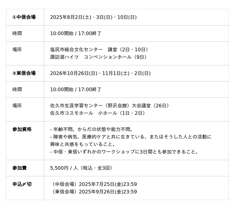 - 応募多数の場合は、お送りいただいた情報をもとに厳選審査し、参加者を決定します。審査結果について、中信会場への参加は2025年7月27日(日)中に、東信会場への参加は10月初旬にメールで通知します。