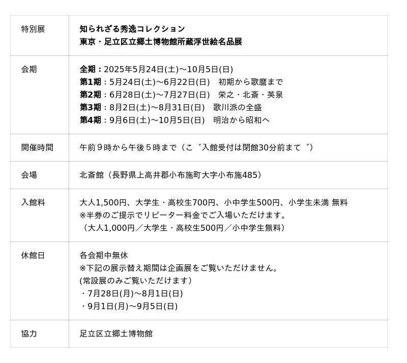 足立区立郷土博物館所蔵の豊富な浮世絵コレクションを4期に分けてご紹介している本展の第3期・第4期の見どころをまとめてご紹介!リピーター割引あり。会期は10月5日(日)まで