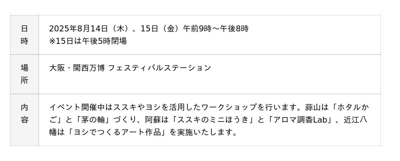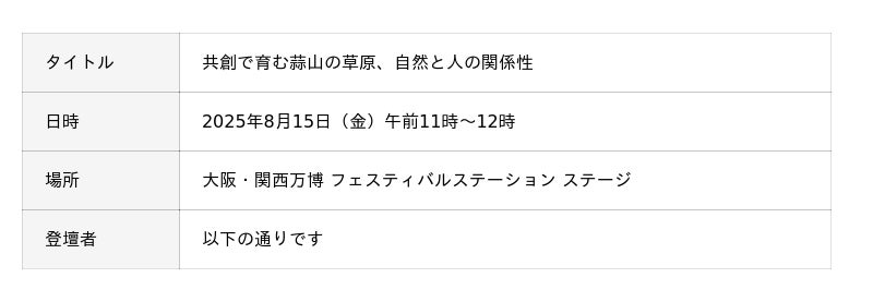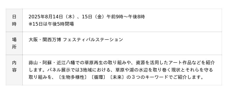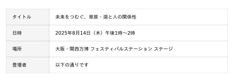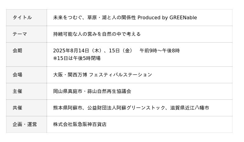 株式会社阪急阪神百貨店(本社:大阪市北区、代表取締役社長:山口俊比古)は、岡山県真庭市が主催するイベント「未来をつむぐ、草原・湖と人の関係性」を企画・運営します。本イベントは、環境にやさしい素材「茅(かや)」を通して「持続可能な人の営みを自然の中で考える」機会の提供を目的に、8月14日と15日、大阪・関西万博のフェスティバルステーションにて開催いたします。「聴く(トークセッション)」「見る (アート・パネル展示)」「触れる(ワークショップ)」の3つのアプローチで、蒜山(岡山)・阿蘇(熊本)・近江八幡(滋賀)の3つの地域ならではの「茅」の魅力や環境保全の取り組みをご紹介します。当社は2020年から真庭市と協業し、人と自然のつながりをブランド化する取り組み「GREENable(グリーナブル)」を進めており、関連して本イベントの企画・運営業務を受託しています。