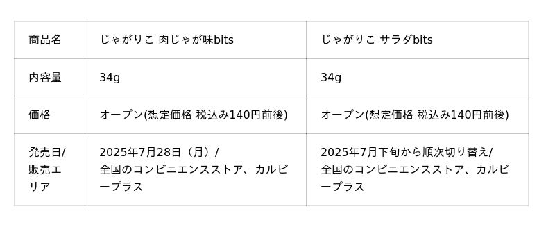 カルビー株式会社(本社:東京都千代田区、代表取締役社長兼CEO:江原 信)は、再販してほしい味として人気の「肉じゃが味」を、ひと口サイズでパクッと食べやすい「じゃがりこ bits」シリーズとして『じゃがりこ 肉じゃが味bits』を手書き風でほっこり可愛いレトロデザインのパッケージにして2025年7月28日(月)から全国のコンビニエンスストア、カルビーアンテナショップ「カルビープラス」で数量限定発売します(無くなり次第終了)。