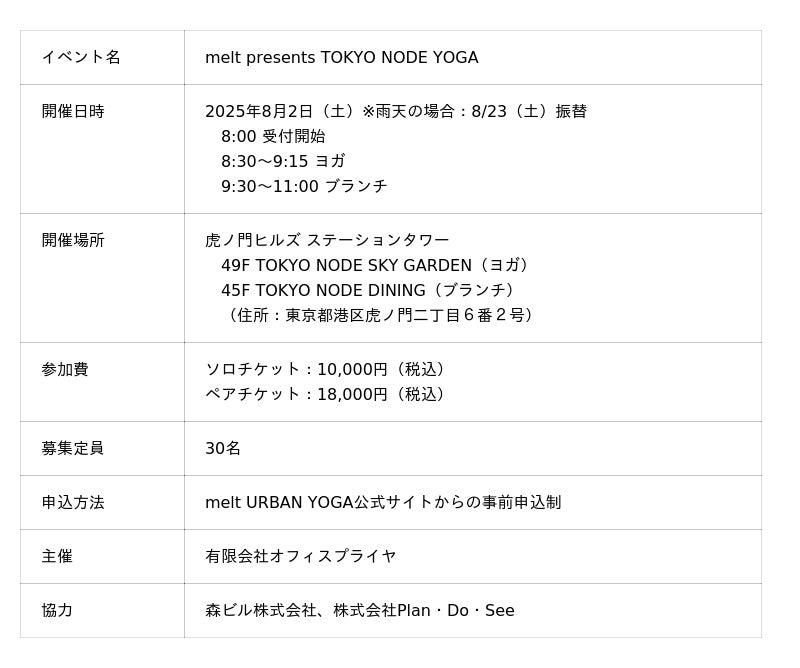 「melt presents TOKYO NODE YOGA」は「melt URBAN YOGA」の一環として、虎ノ門ヒルズ ステーションタワー49F 「TOKYO NODE SKY GARDEN」で、8月2日(土)に開催されるヨガとブランチを組み合わせた新しい都市型ウェルネスプログラムです。地上250mの高さから東京のパノラマを一望できる都内随一の静かなルーフトップガーデンで、インフィニティプールを背景に実施。水面の煌めきが広がる非日常空間で、暑さで自律神経が乱れがちな夏の朝に、心と体へ“ひとさじのととのい”を届ける、唯一無二のウェルネス体験を提供します。ヨガの後には、「TOKYO NODE DINING」(45F)にて、“美と健康を満たすブランチ”をご用意します。天空のラグジュアリー空間で、上質な時間をお楽しみいただけます。