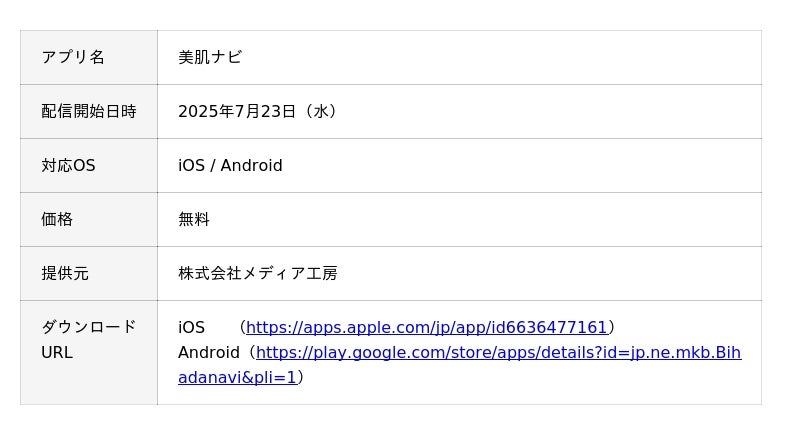 株式会社メディア工房(所在地:東京都港区、代表取締役社長:長沢一男、東証グロース上場:証券コード3815)は、ユーザーの肌悩み解決を目的としたスキンケアプラットフォームアプリ「美肌ナビ」を2025年7月23日(水)にリリースいたします。