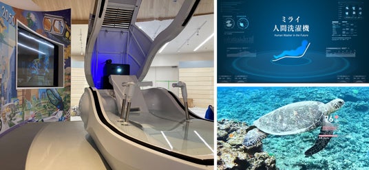 (写真左)大阪ヘルスケアパビリオンに展示中のミライ人間洗濯機 (写真右)中に投影される画像の一部