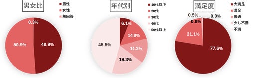 これまで入浴体験された方へ、入浴後にアンケートを実施してまいりました。性別、年代ともに満遍なく、老若男女問わず体験いただきました。また、満足度では「大満足」「満足」合わせて98.7%の方に評価をいただいております。