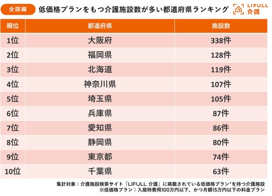 そこで「LIFULL 介護」では、入居時費用100万円以下かつ月額15万円以下の料金プラン(以下、低価格プラン)を持つ介護施設の数を、全国47都道府県、東京都、大阪府とエリア毎にランキング化しました。