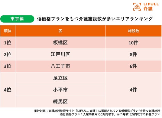 「低価格プランをもつ介護施設数が多い都道府県ランキング」東京編では、板橋区が1位(10件)、江戸川区が2位(8件)、足立区と練馬区が4位(4件)と23区も上位を占めました。