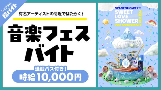 「はたらいて、笑おう。」をビジョンに掲げるパーソルグループのスキマバイトアプリ『シェアフル』やSaaSシフト管理サービス『シェアフルシフト』、就業実績を活用した人材紹介サービス『シェアフルエージェント』などを提供するシェアフル株式会社(本社:東京都港区、代表取締役社長:横井 聡)は、2025年8月29日(金)~31日(日)に山梨県 山中湖交流プラザ きららにて行われる『SPACE SHOWER SWEET LOVE SHOWER 2025 30th ANNIVERSARY』に協賛します。また、イベントを裏側からサポートする超バイトを募集します。