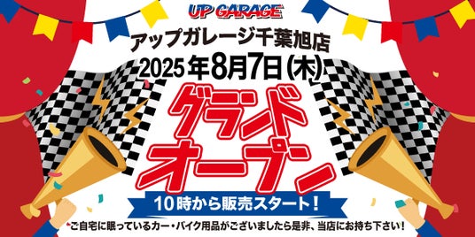 カー&バイク用品のリユース専門店「アップガレージ」を全国展開する株式会社アップガレージグループ(本社:神奈川県横浜市、代表取締役社長:河野映彦、東証スタンダード市場:7134)は、2025年8月7日(木)に、直営店の「アップガレージ千葉旭店」、併設店として「タイヤ流通センターアップガレージ千葉旭店」新規出店いたします。