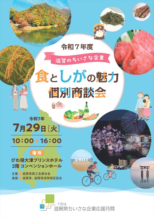 滋賀県商工会連合会(住所:大津市打出浜2番1号 コラボしが21 5階、会長:上西 保)は、滋賀県のご支援をいただき、滋賀県内の中小・小規模事業者が誇る「食」と「観光・サービス、雑貨等」を全国に発信し、新たなビジネスチャンスを創出する場として「滋賀のちいさな企業 食 と しが の 魅力 個別商談会」を令和7年7月29日(火)にびわ湖大津プリンスホテル(住所:大津市におの浜4-7-7)にて開催します。