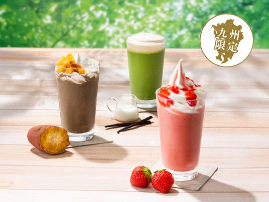 長崎県発祥の「ミルクセーキ」、鹿児島県産の安納芋、福岡県産のあまおう苺と、各地域にちなんだ素材や取り入れた3種類のフローズンドリンクです。抹茶フローズン ミルクセーキ風