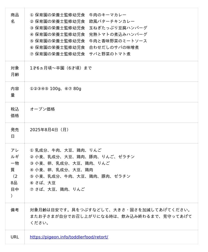 ピジョン株式会社(本社:東京、社長:矢野 亮)は、当社グループ会社ピジョンハーツ株式会社が運営する保育園の栄養士が監修した「保育園の栄養士監修幼児食 牛肉と香味野菜のミートソース」をはじめとするレトルト幼児食7種類を、2025年8月4日(月)より全国のベビー用品専門店・ドラッグストア、スーパーマーケット、当社公式オンラインショップにて販売を開始いたします。