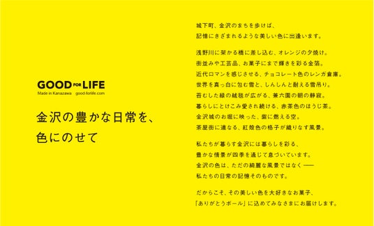 今回のリニューアルでは、金沢の暮らしを彩る豊かな四季の日常を「色」にのせて、それぞれの色にリンクしたストーリーを添えて展開します。“ありがとう”を添える気持ちも、もっと多様で自由であっていい。そんな想いを込めて、8つの色とフレーバーが、新たな感謝のかたちを描きます。