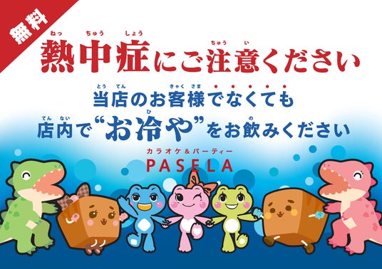 パセラ店舗前に掲示されたPOPには、以下のようなメッセージが記されています。「熱中症にご注意ください。当店のお客様でなくても、店内で“お冷”やお飲みください。」