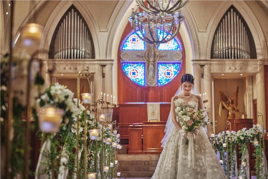 実際の大聖堂で、モデルによる本番さながらの挙式シーンをゲストとして体験。挙式の一連の流れや挙式後のフラワーシャワーなど、結婚式のイメージがよりリアルに。