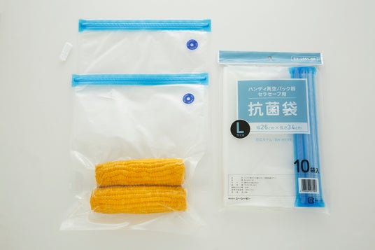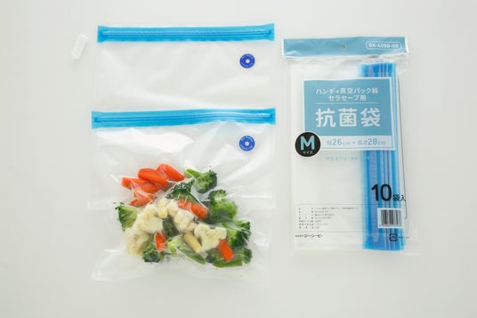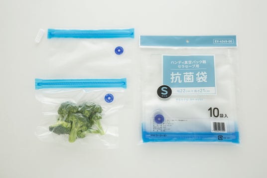 本体セットには購入後すぐに使用できるよう、Sサイズ5枚の専用袋が同梱しています。専用袋は食材を入れるのに安心な抗菌加工で、洗って繰り返し使えます*1。専用袋は食材のサイズや用途に合わせて選べる3サイズです(別売り)。