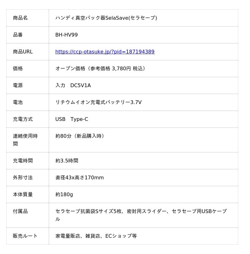 株式会社シー・シー・ピー(東京都台東区、代表取締役社長:横治 一也)は、片手でボタンをワンプッシュすると吸引が始まり専用袋が真空パックになる『ハンディ真空パック器 SelaSave(セラセーブ)』 (オープン価格)を8月中旬より家電量販店、雑貨店、ECショップ等にて順次発売いたします。