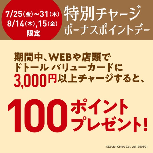 また、7月25日(金)~31日(木)、8月14日(木)、15日(金)の期間、「特別チャージ ボーナスポイントデー」を開催します。ドトール バリューカードを使って、お得なキャンペーンにぜひご参加ください。