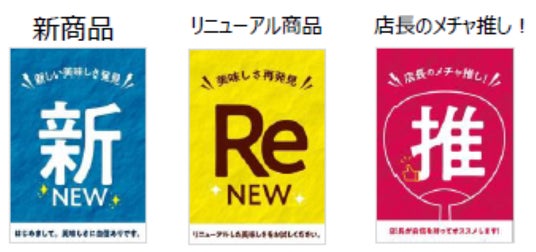 ●マルエツのデリカ売場では、新商品やリニューアル商品、おすすめ商品を以下のラベルでお知らせしています。