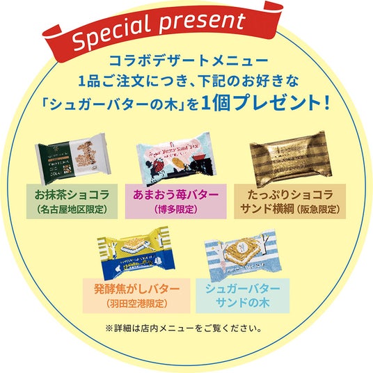 コラボデザートメニュー1品ご注文につき、お好きな『シュガーバターの木』を1個プレゼント!定番はもちろん、普段はなかなか出会えない地域限定フレーバーまで5種類からお選びいただけます。ぜひこの機会に、気になっていた味を試してみてくださいね!