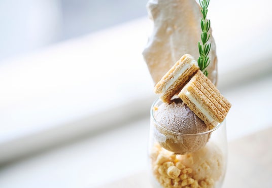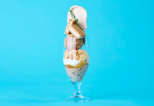 パッションフルーツとほうじ茶のゼリー、コーヒーのブランマンジェの上に生クリームを重ねて、ホワイトチョコのアイスとコーヒージェラートをのせました。シュワッと口どけるコーヒーメレンゲとサクサク香ばしいシュガーバターサンドの木を飾った欲張りパフェです。