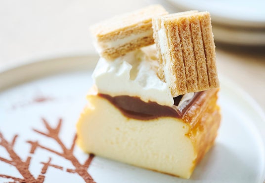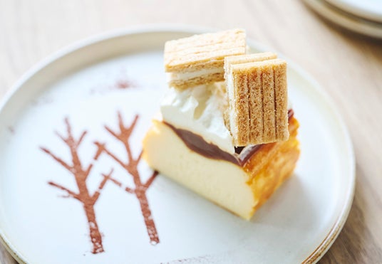濃厚なチーズケーキの上に、ほろ苦キャラメルカフェソースと生クリームを絞り、シュガーバターサンドの木をトッピング。なめらかなチーズケーキと、サクサク香ばしいシュガーバターサンドの木は相性抜群!皿には、ココアパウダーで「シュガーバターの木」のシンボルツリーを描きました。コラボレーション感あふれるデザートメニューです。