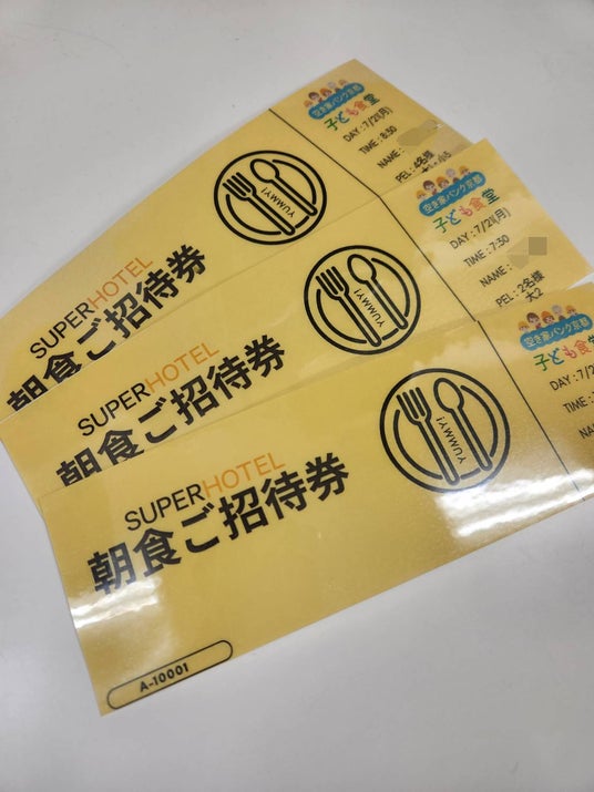 スーパーホテル京都・四条河原町からは、各日程10枚ずつ、お越しいただける時間を記載したチケットを子ども食堂にお渡しします。応募の上参加される方はチケットをもって決まった時間にホテルへお越しいただき、自由に朝食を召し上がっていただくことができます。