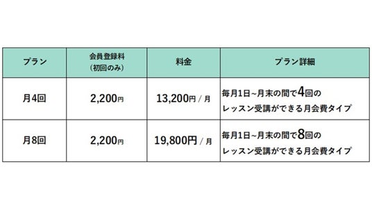 予約専用サイトより、ご希望のレッスン日時をご予約いただく完全予約制です。予約時間の1時間前までお客様ご自身で予約専用サイトからキャンセルが可能で、急な用事などが入ってしまった場合も1回分の費用を消化することなくキャンセル対応が可能で安心です。また、通いたいペースにあわせて、月4回、月8回のプランをお選びいただけます。月の利用回数を超えてご利用されたい場合は1回あたり3,850円をお支払いいただければ追加での受講が可能です。