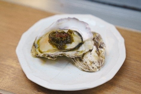 牡蠣のレモンオリーブオイル&青唐オイル漬け乗せ(1個550円)