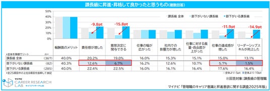 一方で部下のいない課長級では、部下のいる課長級と比較して特に「意思決定に関与できる」「仕事の達成感が増した」「リーダーシップスキルが向上した」という項目が10pt以上低い結果となった。