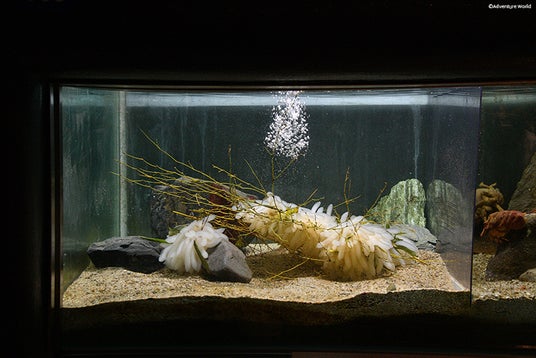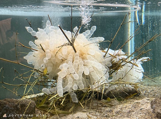 水槽内でパンダが食べ残した竹に産卵されたアオリイカの卵塊をご覧いただけます。運がよければ卵から孵化するシーンをご覧いただけるかもしれません。