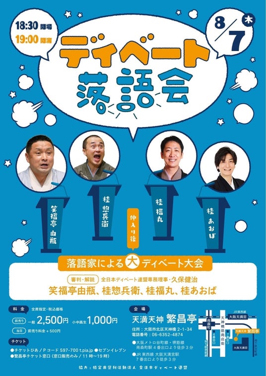 2025年8月7日(木)に天満天神繁昌亭(大阪市北区)にて、落語家たちが本気で論戦を繰り広げる新感覚イベント「ディベート落語会」が開催されます。