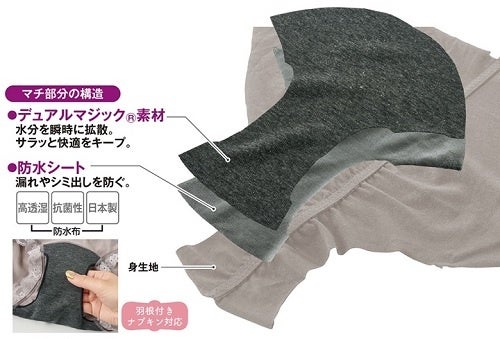 1.毎日のちょっと漏れの不安に、マチ肌側には水分を瞬時に拡散するデュアルマジック(R)素材を使用、防水シートを裏あてして漏れを防ぐ2層構造です。サニタリーショーツとしてお使いいただけるマチは、羽根つきナプキン対応の仕様です。